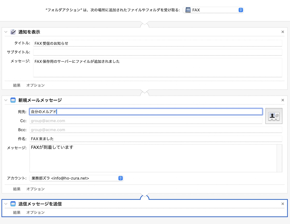 AutoMatorのFolderActionで、メッセージとメールで教えてくれる