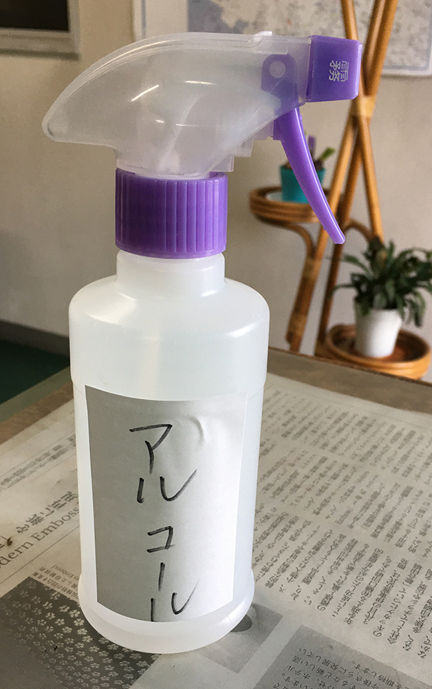 そこで、倉庫に眠っていたニューファインコールの一斗缶からスプレーボトルに移し少々の水を加えて消毒液として使い出しました