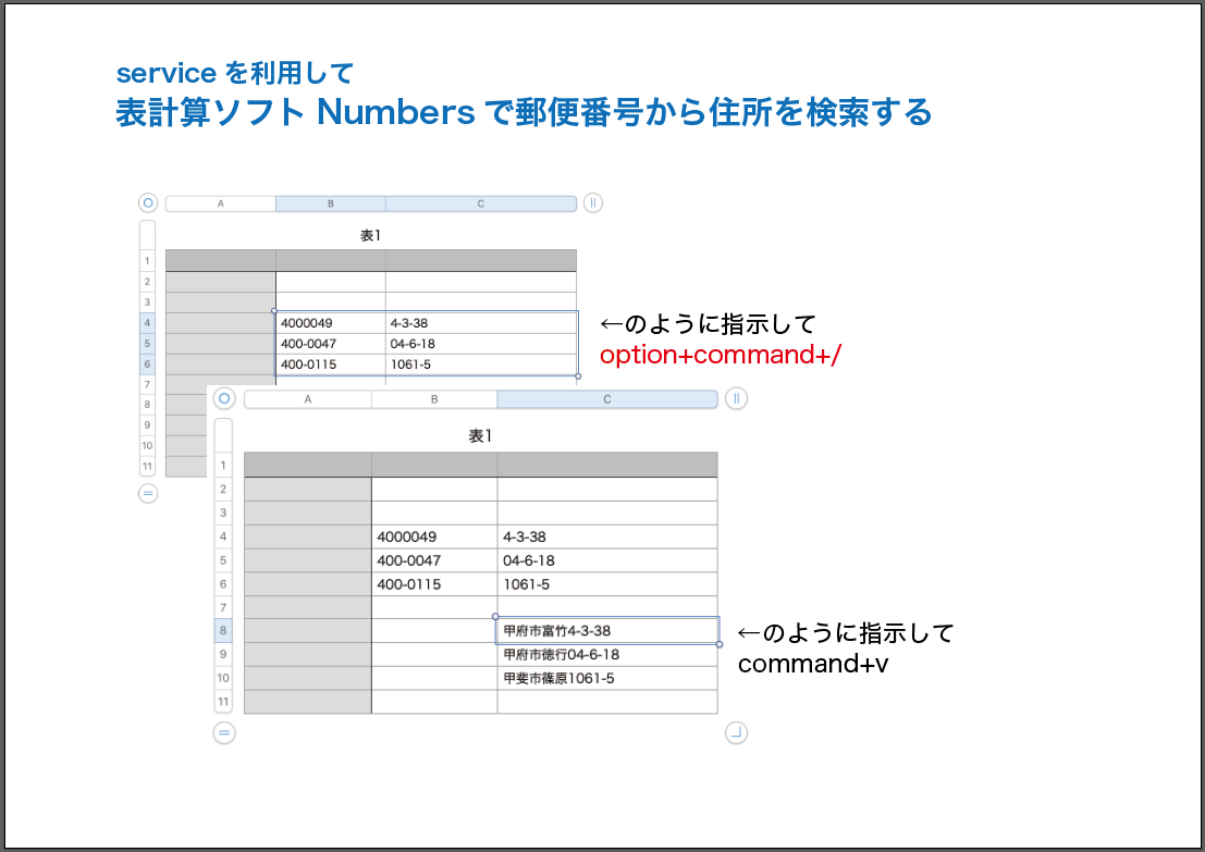 住所から郵便番号を検索する場合も同じで、住所のセルを指示してショートカットで郵便番号がクリップボードに入るのでペーストしてあげます