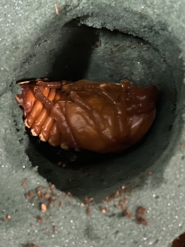 久しぶりに巣箱を確認するとサナギになったカブトムシが数匹地面に転がっていました