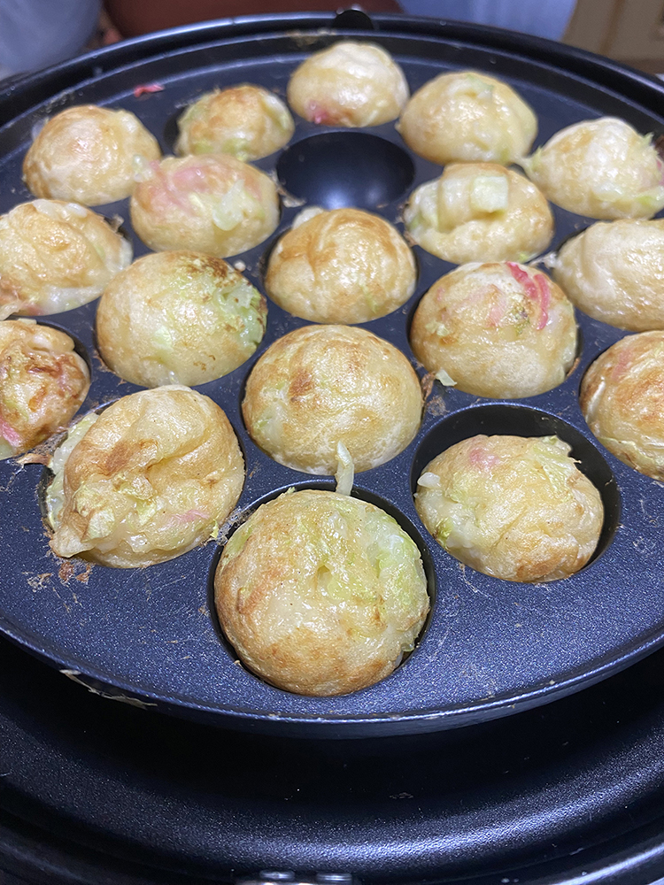 作り始めは、ぐちゃぐちゃになって心配でしたが、焼けるに従い円形に・・・タコ焼きのようになる