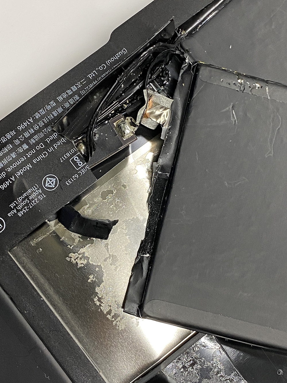 古いバッテリーを剥がして見ました。写真の様に4つのセルがあり、そのうちの一つを力任せに剥がして見ると端子が見えました。