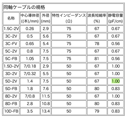 | ケ-ブル | 外径 | 静電容量 | 耐電圧(AC) | 特性インピーダンス |