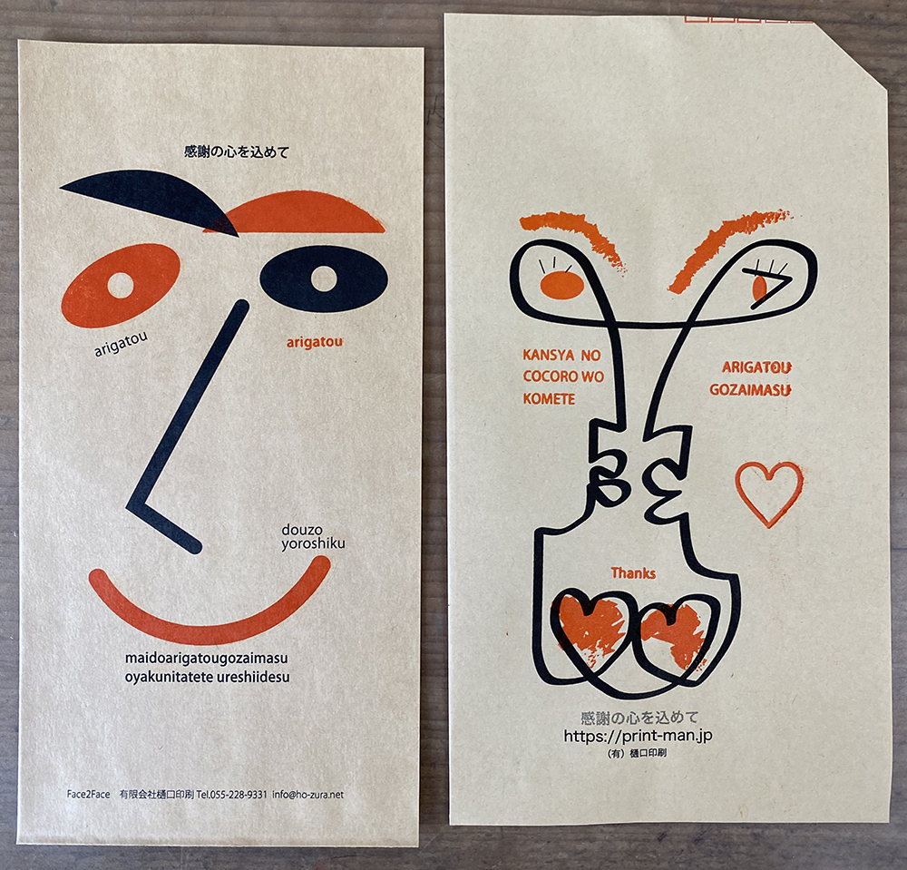 オレンジは、活版で印刷しています、黒はPODデジタルです。下部にはスペースを空けて、名入れなどを後から印刷出来るようになっています。