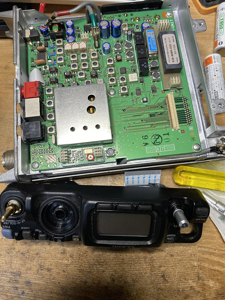 TS790が使えないので、TR850に火を入れてみたら、これもセレクトダイヤルがジャンプしてしまう、シャシーを外して、接点復活スプレーをかけダイヤルをグルグルと回して様子を見る。