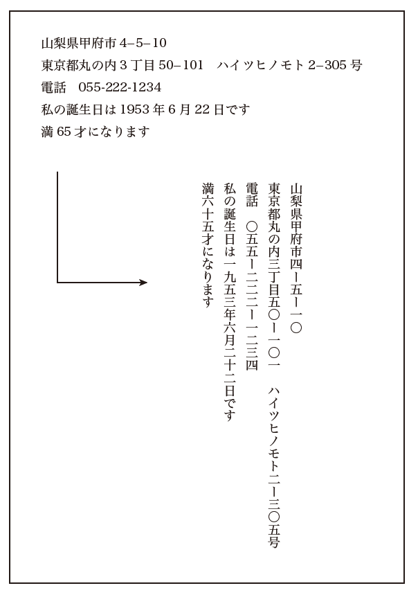 しかし、この住所をタテ文字、漢数字にするには、宛名印刷用のソフトを使ってタテ文字漢数字にしていました。